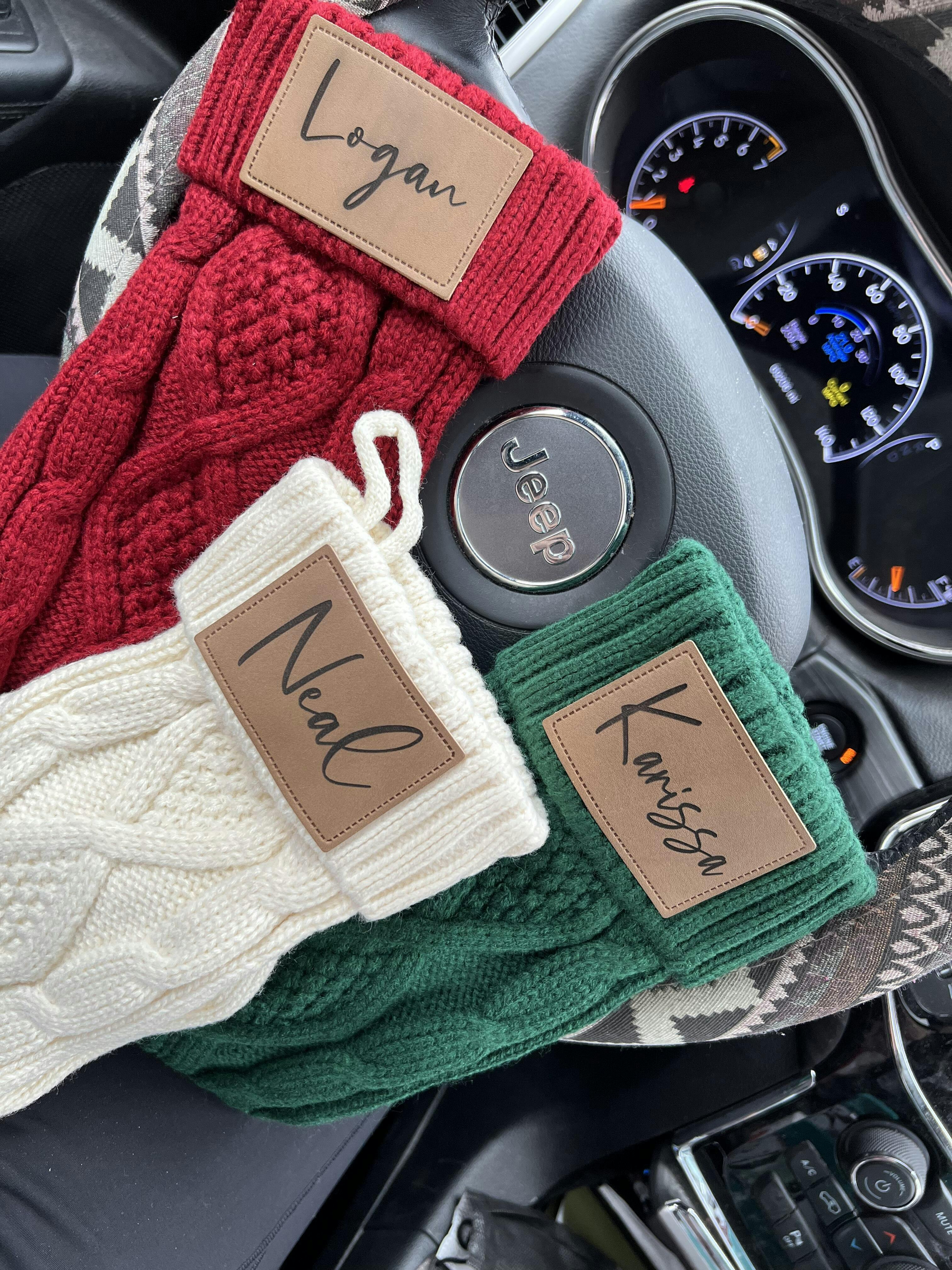 18” knitted Christmas stocking with personalized engraved leather patch. If you would like a certain name on a specific color please specify that in the notes section of your order. Keep in mind I have limited stock of each color. I will do my best to restock as they sell out.